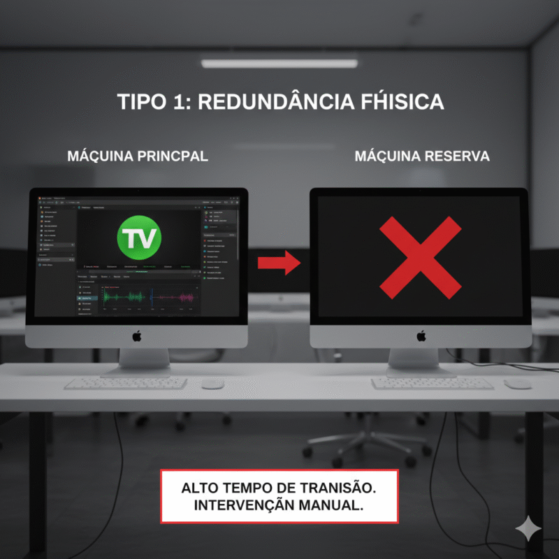 Desvantagem: Ainda exige intervenção manual. O operador precisa reposicionar o playlist e o vídeo no ponto exato em que a transmissão foi interrompida na máquina principal. Um tempo de interrupção, mesmo que breve, ainda existe.
