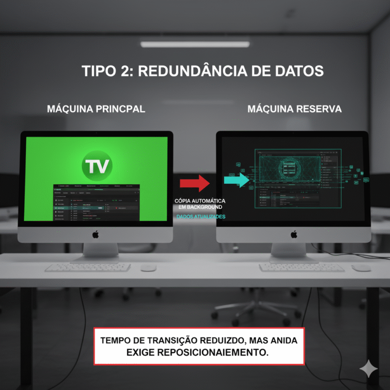 Agrega a segurança física (Tipo 1) com um sistema que roda em background para replicar imediatamente todas as alterações feitas na máquina principal (como alterações na playlist ou ingestão de novos arquivos) para a máquina reserva.