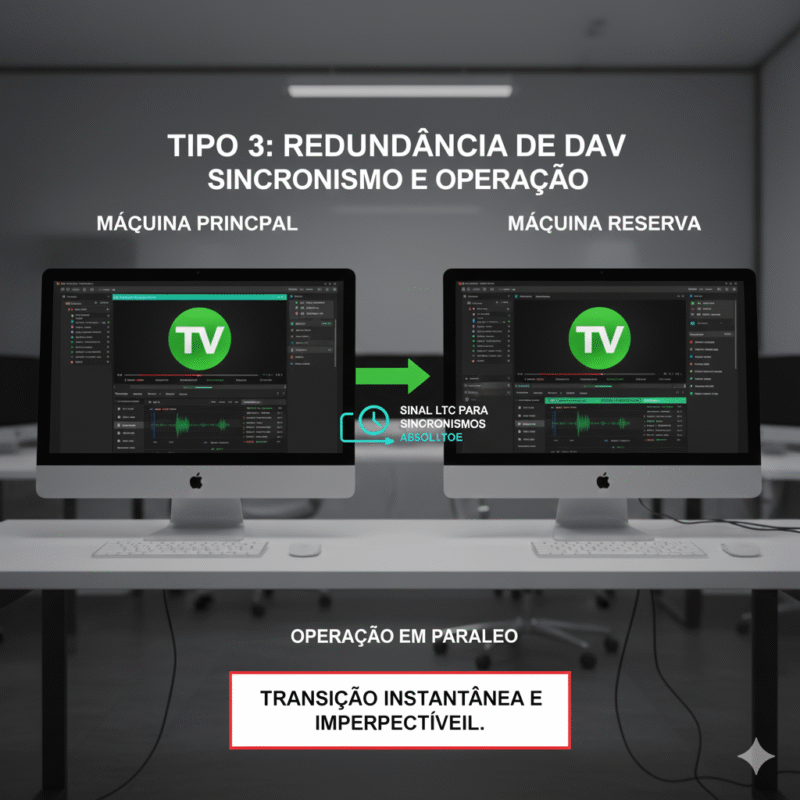 Com a introdução da redundância por LTC, a linha TVPlay 2026 oferece a Redundância de Operação e Sincronismo mais precisa do mercado. Combinando a segurança física, a cópia automática de dados (Tipo 2) e o novo módulo de sincronismo via LTC, o sistema assegura uma transição instantânea e imperceptível ao ar, elevando a confiabilidade e a continuidade da sua programação a um novo patamar.
